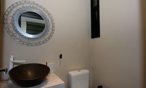 Banheiros organizados com armários integrados.