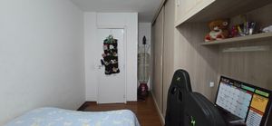 Quarto organizado com armários embutidos.