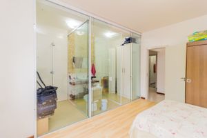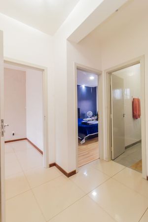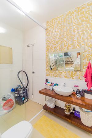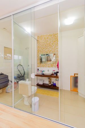 Banheiros organizados com armários integrados.